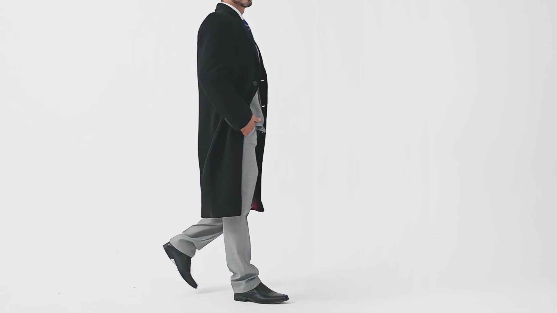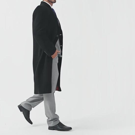 This timeless long overcoat features a three-button fastening and includes a single chest pocket, two hip pockets, and two inside pockets for added convenience. Crafted from a blend of 70% wool, 25% polyester, and 5% cashmere, it is fully lined with luxurious Red satin for a touch of sophistication. The coat is designed with a centre vent at the back for ease of movement and measures 46 inches in length.